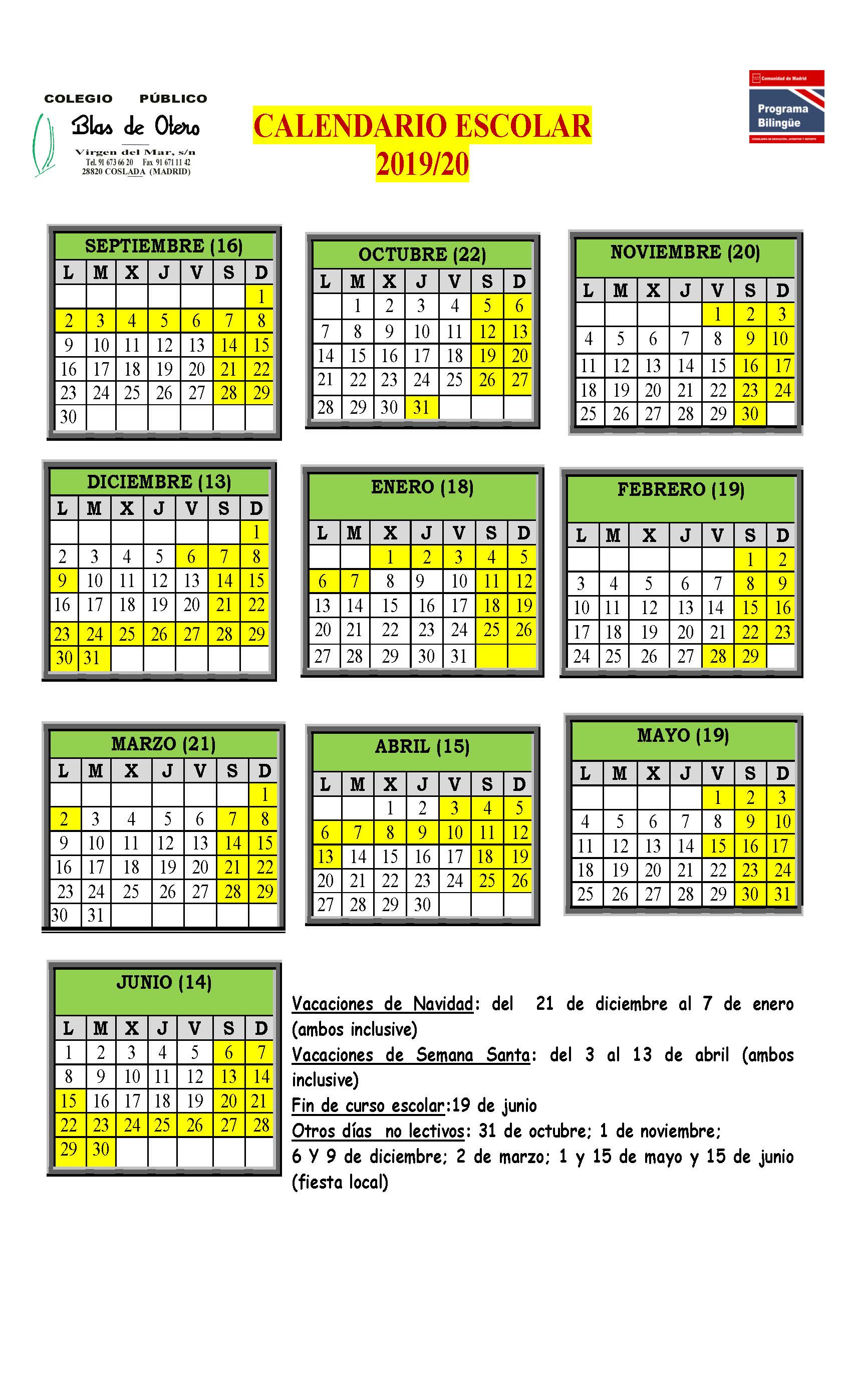Calendario escolar 2019/2020