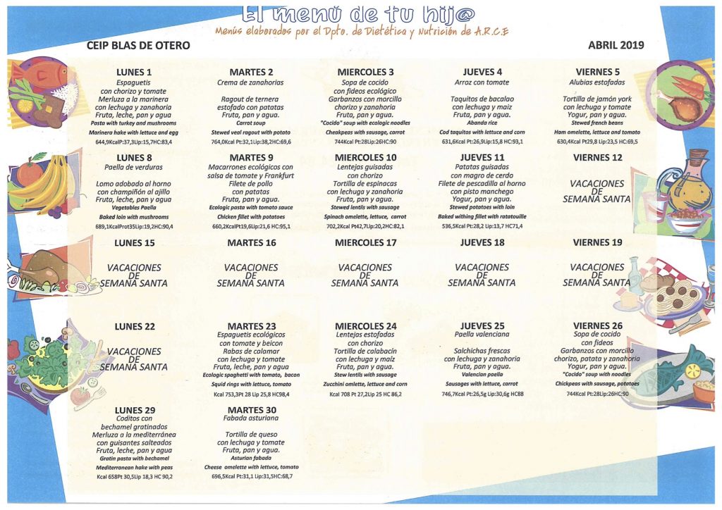 Menú comedor abril 20191 abril, 2019 en Menú comedor Os dejamos el menú del comedor correspondiente al mes de abril de 2019. (Visto 83 veces)